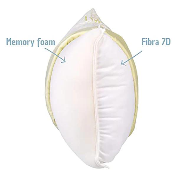 - Da un lato l’innovativa Imbottitura da noi studiata presenta una soffice lastra di memory foam di altissima qualità che si modella perfettamente alle forme di viso e collo grazie al peso e al calore del corpo